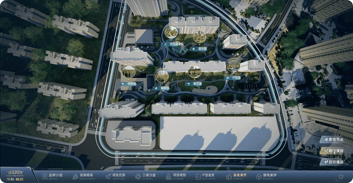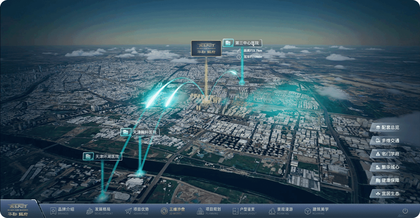 数字沙盘利用实景三维、虚幻引擎、地理信息系统等技术,将项目所在区域的的地形地貌、建筑外观、周边配套、户型结构等信息直观、立体地进行呈现,结合GIS(地理信息系统)的缓冲区分析、路径分析等,突破了传统的二维图纸、实体模型的局限。