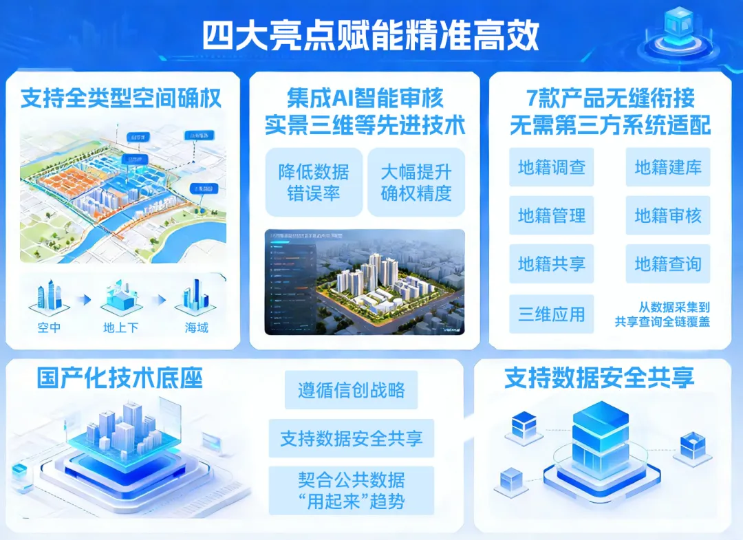 产品深度适配城市立体开发需求,支持空中、地上、地下、海域等全类型空间确权。集成AI智能审核、实景三维等先进技术,降低数据错误率,大幅提升确权精度;7款产品无缝衔接,从数据采集到共享查询全链覆盖,无需第三方系统适配,保障业务连贯性;遵循信创战略构建国产化技术底座,支持数据安全共享,契合公共数据“用起来”趋势。
