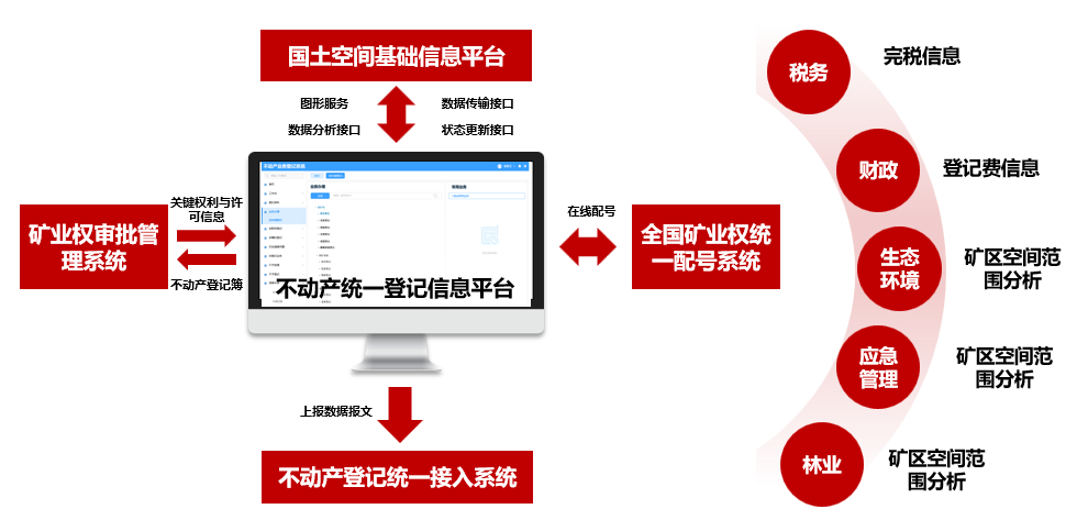 实现矿业权不动产登记后,平台将与国土空间基础信息平台、全国矿业权统一配号系统、不动产登记统一接入系统、矿业权审批管理系统等多部门系统对接,推动信息实时共享,支撑矿业权税收征管、抵押登记网上办理与协同监管。