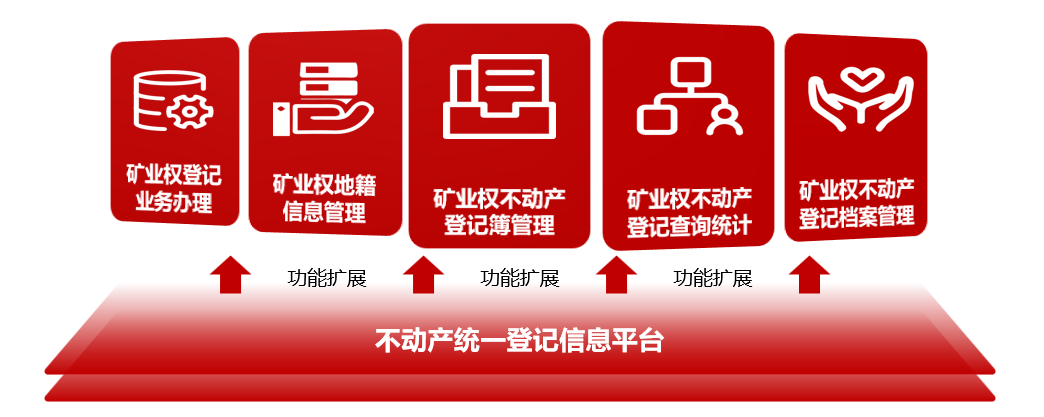 在现有不动产登记平台基础上,围绕矿业权登记业务需求,新增矿业权登记业务办理、地籍信息管理、不动产登记簿管理、查询统计、档案管理等专业化功能模块,全面支撑矿业权登记全流程信息化管理。