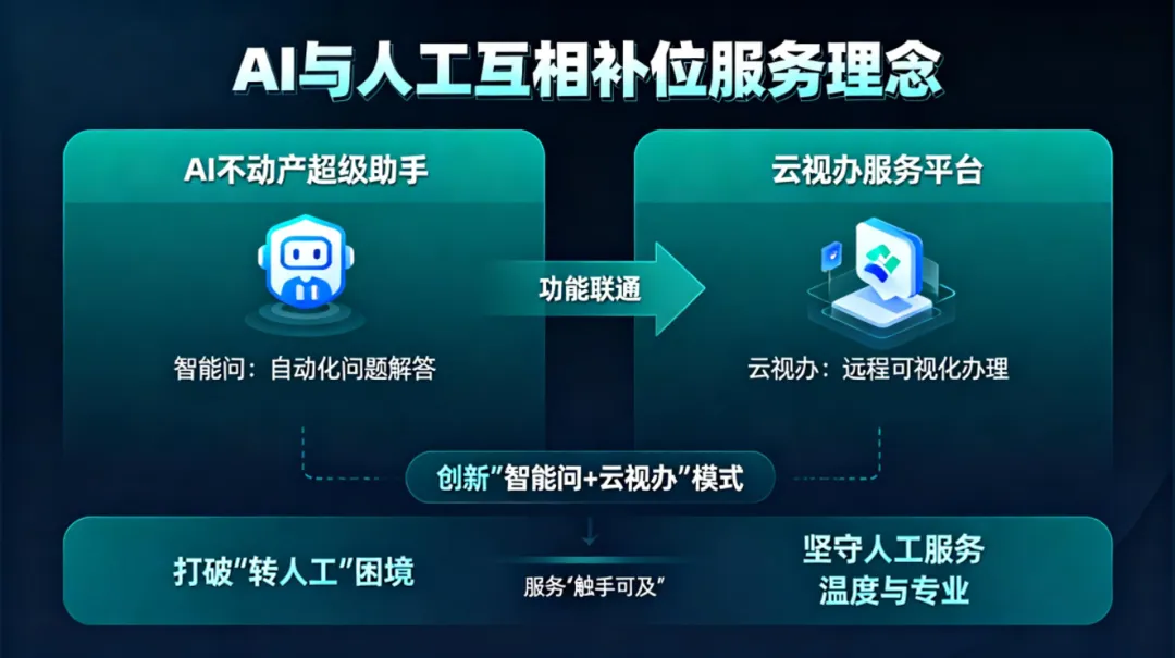 “智能客服应该与人工客服互相补位,而不是单向取代”,煌煌话语振聋发聩。天耀宏图在不动产登记领域践行“AI与人工互相补位”的服务理念,将“AI不动产超级助手”与“云视办”(不动产云视办服务平台)功能联通,创新实现“智能问+云视办”模式,打破“转人工”困境,终结办事种种不便,让服务“触手可及”的同时坚守人工服务的温度与专业。