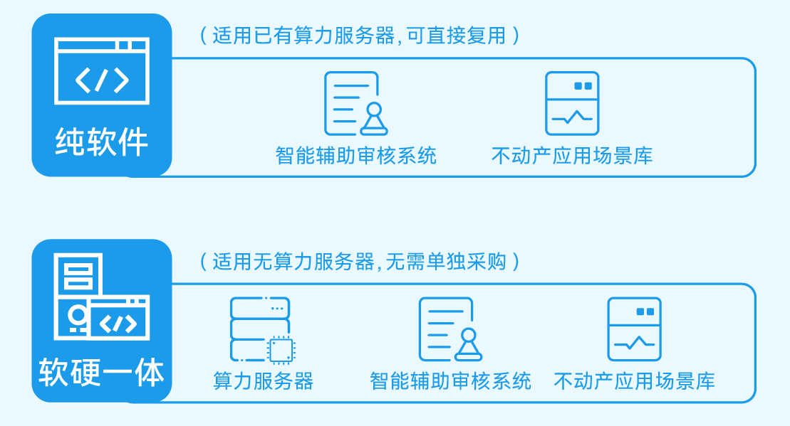 软硬件一体模式:提供包含算力支持在内的完整解决方案,适用于无算力服务器的单位,实现快速部署、即接即用。